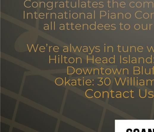 It is important to recognize the wonderful people who support the HHIPC in many different ways. Heartfelt thanks to the members of our community who have opened their homes and hearts to all those involved in the Competition. First, to the host families and over 100 volunteers who take such great care of our competitors, jurors and audience. Next comes a rousing ovation to our remarkable Competition Committee, whose incredible dedication and hard work in support of the HHIPC year-round continually amazes me. Then, let me say BRAVI TUTTI ’ to Maestro ohn Morris Russell and our own Hilton Head Symphony Orchestra for their performance in the Concerto Finals, with added acclaim for my wonderful HHSO staff colleagues Also, we recognize our generous prize sponsors, along with the many businesses who support us through program ads and contributions, both in-kind and cash. The magnificent pianos are delivered to us from New York City by our Artistic Partner, Steinway Sons. Our two spectacular venues St. Luke’s Anglican Church and First Presbyterian Church welcome us into their homes like family. And, of course, I thank all the generous donors whose financial support throughout the year enables us to maintain the highest standard of excellence in all we do.