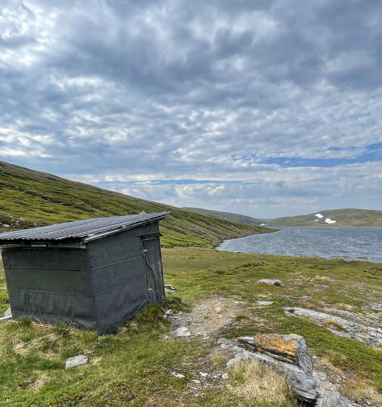 < Várdáncˇohkka er en meget enkelt utstyrt nødbu uten ovn. Det lå fortsatt store snøflekker i nordhellingene.