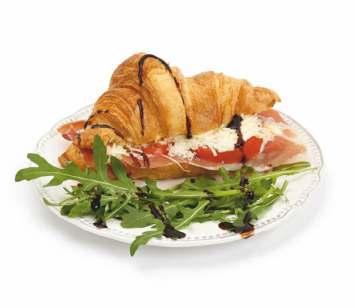 Tobulas užkandis, kuriam abejingų lieka nedaug! Sviestinis kruasanas, pagardintas aukščiausios kokybės vytintu ar mocarelos sūriu, šviežiais pomidorais bei mūsų gamybos padažu.