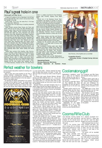 Paul’s great hole in one Cooma golf with Max Turner A field of 87 golfers hit off on Saturday in the St Pats School Gala Golf Day, with a hole in one by Scott Pauls the highlight of the day. Scotty holed out on the 134 metre Par 3 17th Hole with a great shot. Well done. Full results from the large array of trophies presented on the day – Mens Scratch winners Steve Young, Ian Tozer and Kevin Smith 64 off the stick, first Men Handicap Mark Giulani, Lyndon Taylor and Frank Dandrea second Men Handicap Bart Joseph, Simon Commons and Peter Hill third Men Mark and Jenny Rainsford and David Robinson fourth Men Handicap David Goggin, Matthew and Garth Moxon fifth Men Handicap Chandra Singh, Terry Johnston and Mokil Bokil sixth Men Handicap Phil and Craig Crawford and Misook Barnes, seventh Men Handicap Capt Peter Nunn, Nick Massari and Gino Cerro eighth Men Handicap Mark and Jordan Jones and Norm Marshall ninth Men Handicap Sean Smith, Steve Summerville and Ziggy Krpyn 10th Men Handicap Tim Bedingfield, Graeme Dobbie and Paul Crocker 11th Men Handicap Ricky, Matthew and Richard Hanna 12th Men Handicap Brian Searl, Martin Gelling and David Epstein. Ladies Team winners Chris Kaufline, Vida Timmins, and Liz Litchfield, Ladies Nearest the Pin Marion Burke, Ladies Long Drive Jenny Rainsford, Men A Grade Long Drive David Robinson, Men B Grade Long Drive Matthew Moxon, Men C Grade Long Drive Garth Moxon, Men Long Drive for non Handicap Players Frank Andrea, Nearest the Pin fourth Green Lyndon Taylor, Nearest the Pin ninth Father Paul, Nearest the Pin 11th Peter Devereux, Nearest the Pin 17th Scott Pauls