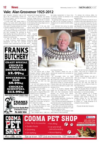 employed in the design department. From there he attended the Sydney Technical College School of Aeronautical Engineering and during the last 12 months of his period there he spent with QANTAS in the drawing office doing design work for components for aircraft. At the conclusion of the war, Alan married Morea Blakey and he resumed work as a builder on Sydney’s North Shore. Their daughter Robyn Louise was born in 1954. Soon Alan was buying and selling houses, an activity which expanded to include development and real estate sales with the opening of an office in Dee Why. A l a n Grosvenor took up painting on the advice of his doctor as a form of relaxation from his business. He took lessons with a Royal Academy exhibitor Gerald Nathan and the war artist Geoff Townsend. From those two people he learnt both sides of art – one a discipline and the very photographic type of art and the other one was Impressionism. Up until then boating had been Alan’s chief recreational pursuit and he designed and built boats from an early age – during the 1930s. He spent many happy hours sailing with his daughter Robyn who crewed for him in competition. A champion sailor, he was FREE HOME DELIVERY COOMA AREA* *conditions apply president of Royal Prince Alfred Yacht Club for a time. It was his wish that following his death that “a bow wave” be held for him rather than a wake. In 1959, Alan Grosvenor came to the Snowy Mountains for a ski holiday at Perisher Valley. This was the first of many painting 22 Bombala St, Cooma trips to Jindabyne. Alan changed tack in 1963 from