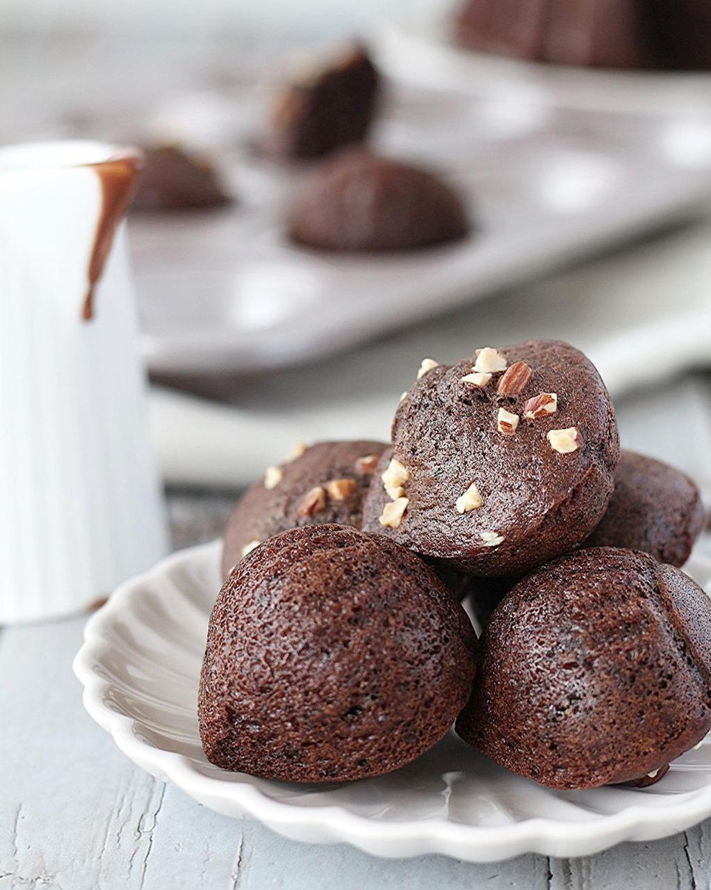 Coat the holes in your pan with butter, then dust it with cocoa powder, remove any excess powder and set aside.