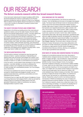 OUR RESEARCH The School conducts research within four broad research themes In the most recent national audit of research excellence (ERA 2018), the School obtained the maximum overall rating of 5 for Physical Sciences, including the maximum rating of 5 in each of our assessed fields of research and the highest rating for the impact of our research – one of only a handful of universities in Australia to achieve these outstanding results.