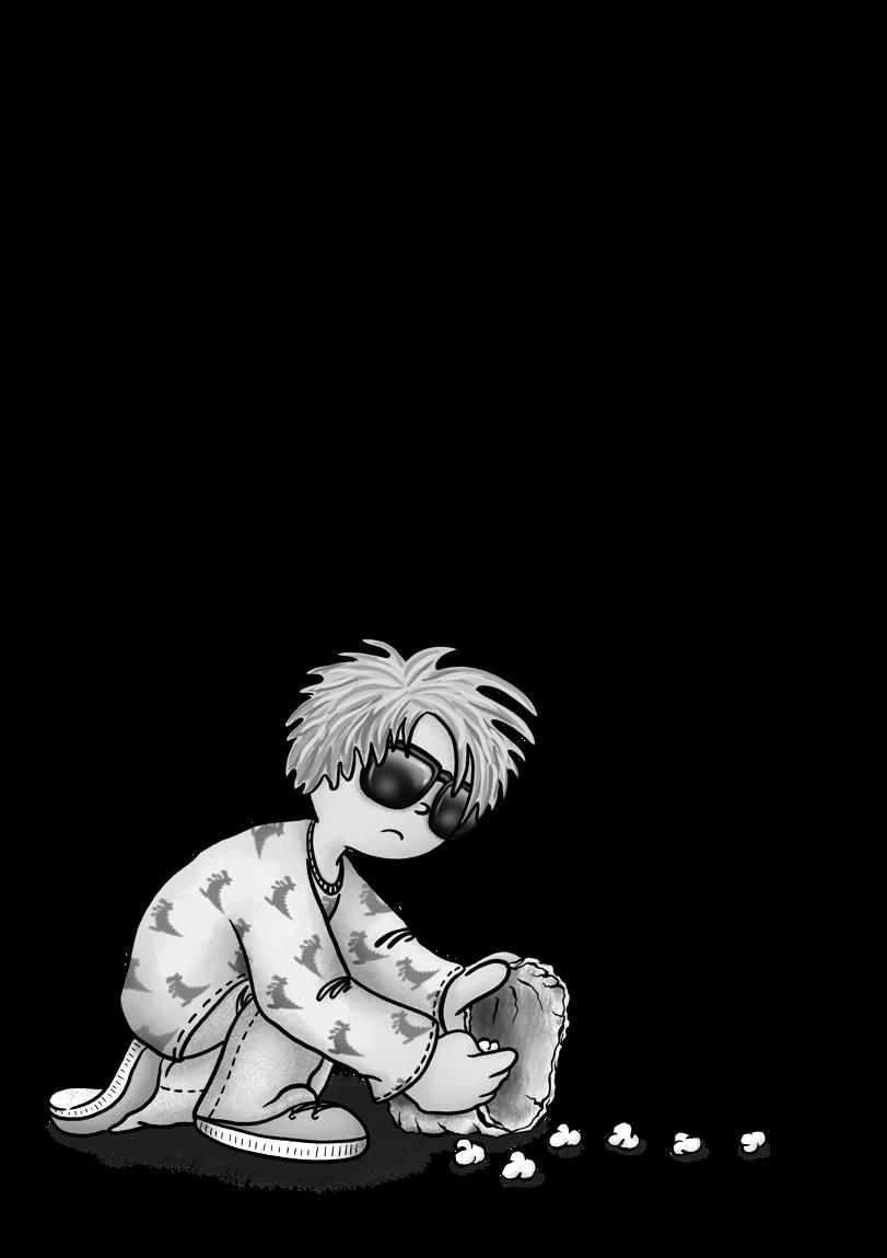 Da taucht ein riesiger Seehund so plötzlich vor ihm auf, dass Oskar vor lauter Schreck mit seiner prallgefüllten Popcorntüte umfällt. Sofort kullert die Hälfte heraus.