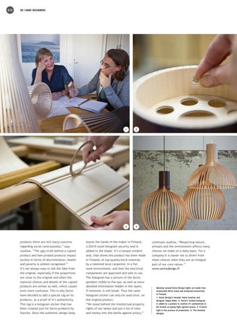Opening spread Secto Design lights are made from sustainable Birch wood and produced exclusively in Finland. 1. Secto Design’s founder Tuula Juselius and designer Seppo Koho. 2. Secto’s custom hologram is added to a product to confirm it’s authenticity in the brands on-going fight against piracy. 3. A Secto light in the process of production. 4. The finished designs.