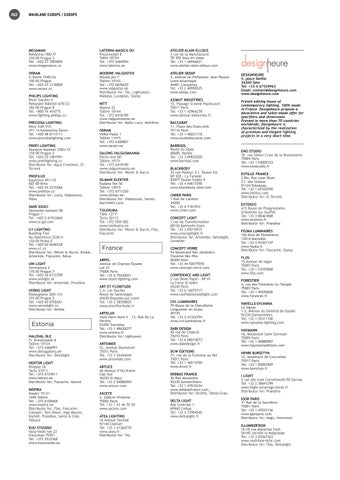 ARPEL Avenue de Champs Elysees Lot 41 75008 Paris Tel: +33 6 75630051 www.arpel-lighting.com ART ET FLORITUDE Z.A. Les Ouches Route de Santranges 45630 Beaulieu-sur-Loire Tel: +33 2 38358825 www.artetfloritude.fr ARTELUX Zone Paris Nord Ii - 13, Rue De La Perdrix 93290 Tremblay Tel: +33 1 48630077 www.artelux.fr Distributor for: Lightyears ARTEMIDE 52, avenue Daumesnil 75012 Paris Tel: +33 1 43444444 www.artemide.com ARTUCE 46 Avenue d’Occitanie Cap Sud 36250 St Maur Tel: +33 2 54086094 www.artuce.com ASCETE 2, Galerie Vivienne 75002 Paris Tel: +33 1 43 46 70 39 www.ascete.com ATEA LIGHTING 16 Avenue Stendal 92140 Clamart Tel: +33 1 41360770 www.atea.fr Distributor for: TAL