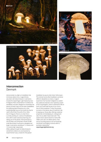 Interconnection Denmark Interconnection is a light art installation that immerses visitors into a magical forest, abundant with bioluminescent mushrooms. Created for Copenhagen Light Festival by Sara Ki Noguera Plans and Jonathan Ki Lindhult, the installation has been designed to emphasise the beauty of these fungi, and the open possibilities for exploring bioluminescence as a new, sustainable light source that could one day be used to illuminate the parks of our cities. Sara Ki Noguera Plans is an artist that is currently working on a series of installations that call for action towards preserving and taking care of the planet. Interconnection is one of these, and comprises a forest of 400 small, illuminated mushrooms, alongside two larger mushrooms, standing at 1.2-metres and 1.5-metres high respectively. While walking through the bioluminescent wonderland, visitors are accompanied by experimental music, created for this special
