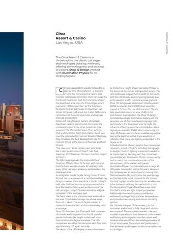 be limited to a height of approximately 1ft due to the design of the curtain wall spandrel panels. The LED media was to span the full width of the south, with the LED density becoming progressively less at the western end to produce a visual gradient. Shop 12’s design was based upon closely spaced RGBW luminaires. Each RGBW pixel would be spaced at 57mm. The use of illumination Physics data pixels illuminated an area of 40mm for each fixture. In proportion, the Shop 12 design mimicked Las Vegas’ illumination history and the pervasive use of the incandescent signage bulb, particularly in the downtown area. At night, the influence of history would be unmistakable, albeit digitally recreated in RGBW. Most importantly, the new LED fixtures were to be as invisible as possible during the daytime so that there would be no indication that there was lighting embedded in the façade at all. Individual control of every pixel in four colours was required – a total of 94,675, including the signage. In daylight, the LED lighting equipment needed to be imperceptible, blending with the curtain wall spandrel panels. illumination Physics consequently had to match the custom white colour of the painted parts of the curtain wall panels. illumination Physics has manufactured a range of LED pixels mounted in strings for years. However, the company was an early mover in moving from DMX onboard to SPI protocol for the pixel strings and ArtNet as the input protocol for the drivers. Not only highly cost-effective, but this would prove to be the key to defining the method of control. The illumination Physics Data Pixel 6 was ideal from both a size and light output perspective. Additionally, the metal housing could better withstand Las Vegas’ high summer temperatures and provides more sturdy and robust mounting options. But this was only part of the answer, just the luminaires and drivers; a fully integrated solution was required: The data pixels needed to be preinstalled in panels and then delivered to the curtain wall factory and integrated into the curtain wall modules that would form the building envelope of Circa’s hotel tower. The curtain wall panels would then be tested and shipped to the construction site in Las Vegas.
