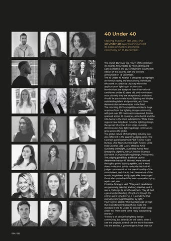 The end of 2021 saw the return of the 40 Under 40 Awards. Resurrected by Filix Lighting and Light Collective, the 2021 instalment was the 6th edition of the awards, with the winners announced on 15 December. The 40 Under 40 Awards is designed to highlight an honour young and outstanding individuals who work in a creative capacity within the application of lighting in architecture. Nominations are accepted from international candidates under 40 years old, and nominators must cite why they are exceptional; candidates should be passionate about lighting and display outstanding talent and potential, and have demonstrable achievements in the field. The returning 2021 competition elicited a huge response from the lighting design community, with just over 300 nominations received. Entries spanned across 36 countries, with the UK and the USA home to the most submissions. While these regions have long been hubs for lighting design, the spread of entries from other countries demonstrates how lighting design continues to grow across the globe. The global nature of the lighting industry was also reflected in the awards’ judging panel. The 6-person panel comprised Paul Traynor (Light Bureau, UK); Regina Santos (Light Fusion, UAE); Elias Cisneros (333 Luxes, Mexico); Aviva Gunzberg (NDYLight, Australia); Randy Reid (Designing Lighting, USA); Christine Sicangco (Christine Sicangco Lighting Design, Philippines). The judging panel had a difficult task to determine the top 40. Winners were selected through a points scoring system, and it went down to decimal points to decide the final 40. Judges commented on the overall quality of the submissions, and due to the close nature of the results, organisers and judges alike have urged those who missed out this year to consider trying again next year. Christine Sicangco said: “This year’s candidates are genuinely talented and very creative, and it was a challenge to pick the winners. They all had a great understanding of light and though the entries were very diverse, it is wonderful that everyone is brought together by light.” Paul Traynor added: “The standard was so high that I wondered if I would have made the standard if the 40 Under 40 existed when I was under 40. There were some really outstanding entries.” “I worry a bit about the lighting design community, but when I saw the talent, when I saw the projects, when I saw the work that went into the entries, it gave me great hope that our 034 / 035