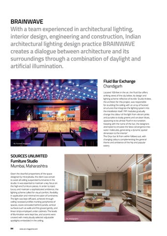 BRAINWAVE With a team experienced in architectural lighting, interior design, engineering and construction, Indian architectural lighting design practice BRAINWAVE creates a dialogue between architecture and its surroundings through a combination of daylight and artificial illumination. Fluid Bar Exchange Chandigarh Located 100-feet in the air, the Fluid Bar offers striking views of the city below, its design and lighting scheme reflective of its title. Studio Ardete, the architect for this project, was responsible for studding the ceiling with an array of faceted structures that integrate the lighting system into the installation itself. FRP modules gradually change the colour of the light from vibrant pinks and purples to dusky greens and cerulean blues, appearing to be almost ‘fluid’ in its transition. Keeping with the name of the bar, the designers attempted to emulate the ‘slow convergence into water molecules, generating a dynamic spatial dimension to the interior’. The Onyx bar lit from within follows suit, with changing colours complementing the general theme and ambience of the hip and popular eatery.