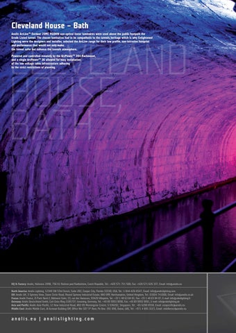 Cleveland House – Bath Anolis ArcLineTM Outdoor 20MC RGBNW non-optical linear luminaires were used above the public footpath the Grade Listed tunnel. The chosen luminaires had to be sympathetic to the tunnels heritage which is why Enlightened Lighting were the designers and installer, selected the ArcLine range for their low profile, non-intrusive footprint and performance that would not only make the tunnel safer but enhance the tunnels atmosphere.