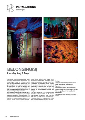 The concept of BELONGING(S) began as an exploration of the meaning of Christmas. For the privileged among us, this often means time with family and friends, feasting, gifts and general togetherness. In cruel contrast to this, for many others this time will be spent torn apart from loved ones, being uprooted, fleeing their homes and making dangerous journeys in hopes of finding a safe place to settle. BELONGING(S) is an inverted Christmas tree of suspended items twinkling in the glowing light like festive decorations, coloured red, gold and green. On closer inspection of the items, we see that they are not decorations but functional and personal pieces; watches, photos, passports,
