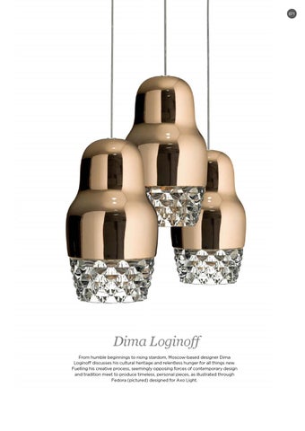Dima Loginoff From humble beginnings to rising stardom, Moscow-based designer Dima Loginoff discusses his cultural heritage and relentless hunger for all things new. Fuelling his creative process, seemingly opposing forces of contemporary design and tradition meet to produce timeless, personal pieces, as illustrated through Fedora (pictured) designed for Axo Light.
