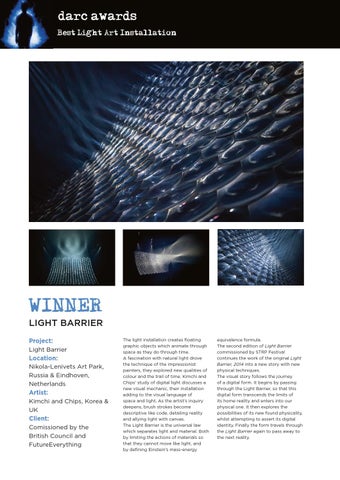 equivalence formula. The second edition of Light Barrier commissioned by STRP Festival continues the work of the original Light Barrier, 2014 into a new story with new physical techniques. The visual story follows the journey of a digital form. It begins by passing through the Light Barrier, so that this digital form transcends the limits of its home reality and enters into our physical one. It then explores the possibilities of its new found physicality, whilst attempting to assert its digital identity. Finally the form travels through the Light Barrier again to pass away to the next reality.