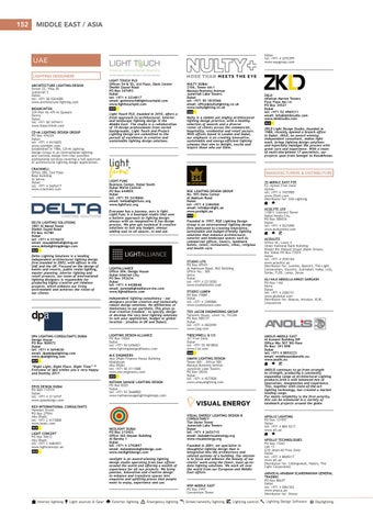 LIGHTING DESIGN ALLIANCE PO Box 14564 Dubai tel: +971 50 6456021 www.lightingdesignalliance.com M-E ENGINEERS Abu Dhabi Finance House Building Khalidiyah Abu Dhabi tel: +971 50 3111008 www.me-engineers.com NATHAN SAVAGE LIGHTING DESIGN PO Box 8203 Dubai tel: +971 55 5668850 www.nathansavagelightingdesign.com