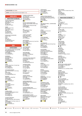 LIGHTING CONCEPTS 8 Midas Touch, 94 Lullanagar Pune 411040 tel: +91 2026835003 www.lightingconcepts.in LIGHTING DESIGN BUREAU B-803 Gorakshdham, Cascade Compound Kulup Wadi Mumbai 400066 tel: +91 2264201623 www.ldbindia.com LIGHTING ERGONOMICS INDIA Kusum Kunj, (ARJ Group), 83/1 Plot No. 2, Sarang Society Sahakarnagar-2 Pune 411009 tel: +91 2024231339 www.lightingergonomics.com LIGHTING RESEARCH & DESIGN Bhavana Apartments, Flat No.3, First Floor F-142, 8th Cross Street, Annanagar East Chennai 600102 tel: +91 4426616054 www.lighting-rnd.in