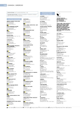 CONSULLUX LIGHTING CONSULTANTS / CROSSEY ENGINEERING 2255 Sheppard Avenue East Suite E-331 Toronto ON M2J 3Y1 Tel: +1 416 497 3111 www.cel.ca CS DESIGN 310 Victoria Ave, suite 408 Westmount QC H3Z 2A9 Tel: +1 514 507 4744 www.designcs.ca ÉCLAIRAGE PUBLIC 9320 Boulevard St-Laurent Bureau 801 Montreal QC H2N 1N7 Tel: +1 514 523 3361 www.eclairagepublic.ca EOS LIGHTMEDIA #310 - 825 Powell Street Vancouver BC V6A1H7 Tel: +1 604 639 5488 www.eoslightmedia.com GABRIEL MACKINNON 1-109 Murray Street Ottawa ON K1N 5M5 Tel: +1 613 241 1822 www.gabrielmackinnon.com GRAHAM H. GREGORY DESIGN 141-1489 Marine Drive West Vancouver BC V7T 1B8 Tel: +1 604 922 5750 www.ghgdesign.ca H.H. ANGUS & ASSOCIATES 1127 Leslie Street Don Mills Toronto ON M3C 2J6 Tel: +1 416 443 8273 www.hhangus.com HIDI RAE CONSULTING ENGINEERS 1 Yonge St., Suite 2100 Suite E-331 Toronto ON M5E 1E5 Tel: +1 416 364 2100 ISHAKLIGHTING 97 Lacewood dr. Richmond Hill ON L4S0E6 Tel: +1 647 267 3647 www.Ishaklighting.com JUTRAS - BATHALON BUREAU D’ÉTUDE LUMIÈRE 552 Rang 1 L’Avenir Quebec QC J0C 180 Tel: +1 819 394 3350 www.etudelumiere.com LIGHTBRIGADE ARCHITECTURAL LIGHTING 78 Kingston Road Toronto ON M4L 1S6 Tel: +1 416 698 9899 www.lightbrigade.ca