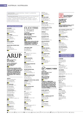 HARON ROBSON LIGHTMATTERS 181 First Avenue PO Box 963 Fire Dock NSW 2046 Tel: +61 2 9712 5544 www.lightmatters.net HOLLAND LIGHTING DESIGN PO Box 41605 Charleston SC 29423 Tel: +61 8 43 514 2892 www.hollandlightingdesign.com ILLUMINATE LIGHTING DESIGN Level 2, 21 Bouverie Street Carlton VIC 3053 Tel: +61 3 9418 3535 www.illuminateld.com JENNI GILLARD ARCHITECTURAL LIGHTING DESIGNERS P.O. Box 425 Paddington Brisbane Queensland 4046 Tel: +61 7 38525582 KLAASEN LIGHTING DESIGN 45 Moojebing Street Ashfield WA 6054 Tel: +61 8 9379 3439 www.kldesign.co LDP 213-217 Palmer Street Darlinghurst Sydney NSW 2010 Tel: +61 2 9360 9250 www.ldp.net LEND LEASE 30 The Bond, 30 Hickson Road Millers Point Sydney NSW 2000 Tel: +61 2 9237 5512 www.lendlease.com LIGHT ART PO Box Q323 Queen Victoria Building NSW 1230 Tel: +61 4 0700 3508 www.lightart.com.au