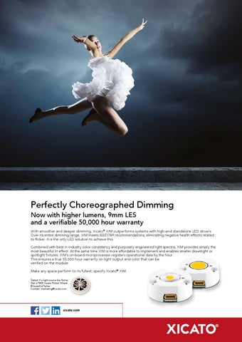With smoother and deeper dimming, Xicato® XIM outperforms systems with high-end standalone LED drivers. Over its entire dimming range, XIM meets IEEE1789 recommendations, eliminating negative health effects related to flicker. It is the only LED solution to achieve this. Combined with best in industry color consistency and purposely engineered light spectra, XIM provides simply the most beautiful lit effect. At the same time XIM is more affordable to implement and enables smaller downlight or spotlight fixtures. XIM’s on-board microprocessor registers operational data by the hour. This ensures a true 50,000 hour warranty on light output and color that can be verified on the module. Make any space perform to its fullest; specify Xicato® XIM. Detect if a light source has flicker. Get a FREE Xicato Flicker Wheel #XicatoNoFlicker Contact: marketing@xicato.com