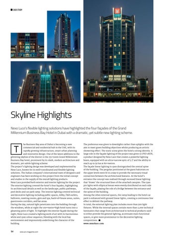 Skyline Highlights Nexo Luce’s flexible lighting solutions have highlighted the four façades of the Grand Millennium Business Bay Hotel in Dubai with a dramatic, yet subtle new lighting scheme.