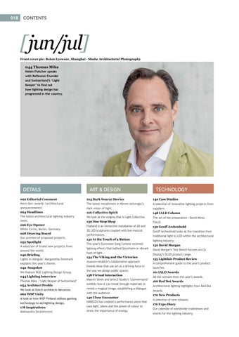 DETAILS 022 Editorial Comment More darc awards /architectural announcements! 024 Headlines The latest architectural lighting industry news. 026 Eye Opener White Circle, Berlin, Germany 028 Drawing Board Our preview of proposed projects. 032 Spotlight A selection of brand new projects from around the world. 040 Briefing Lights in Alingsås’ Margaretha Stenmark explains this year’s theme. 042 Snapshot We feature RGE Lighting Design Group. 044 Lighting Interview Thomas Mika - ‘Light Keeper of Switzerland’ 054 Architect Profile We look at Dutch architects Mecanoo. 062 WSP Unity A look at how WSP Finland utilises gaming technology to aid lighting design. 178 Inspirations Aleksandra Stratimirovic