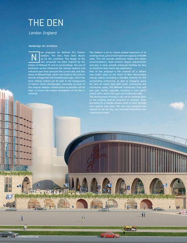 Renderings: AFL Architects ew proposals for Millwall FC’s historic stadium, The Den, have been drawn up by AFL architects. The design of the new proposals has been inspired by the history of Millwall FC and its surroundings. The use of brickwork arches references the railway viaducts and industrial past that surround the current site, and also those at Millwall Park, which was home to the club on the Isle of Dogs over one hundred years ago, where the brick railway viaduct can be seen in the background of historic match photographs. Internally, as much of the original stadium infrastructure as possible will be kept, to ensure the unique atmosphere of the Den is retained.