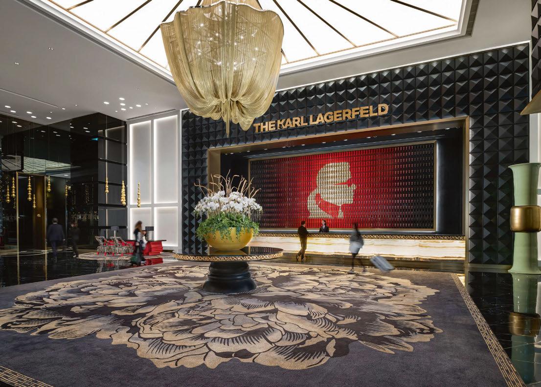 from the Orient, guestrooms feature custom headboards inspired by Chinese coins that represent good fortune, alongside circular archways that draw on the shape of traditional Chinese moon gates. The concept extends to the restaurant, spa and Book Lounge, a space inspired by the designer’s home in Paris, where he displayed a collection of over 300,000 books. Reflecting Lagerfeld’s passion for collaboration, specially-commissioned furnishings include sculptures by Marcel Wanders and Jean-Michel Othoniel, while details such as bathrobes and bedsheets are an ode to couture. Naturally, Lagerfeld has introduced some quirky touches too; his unmistakable profile graces everything from signage to artwork, and there’s a statue of Choupette, his beloved feline companion, altogether making for a suitably stylish stay.