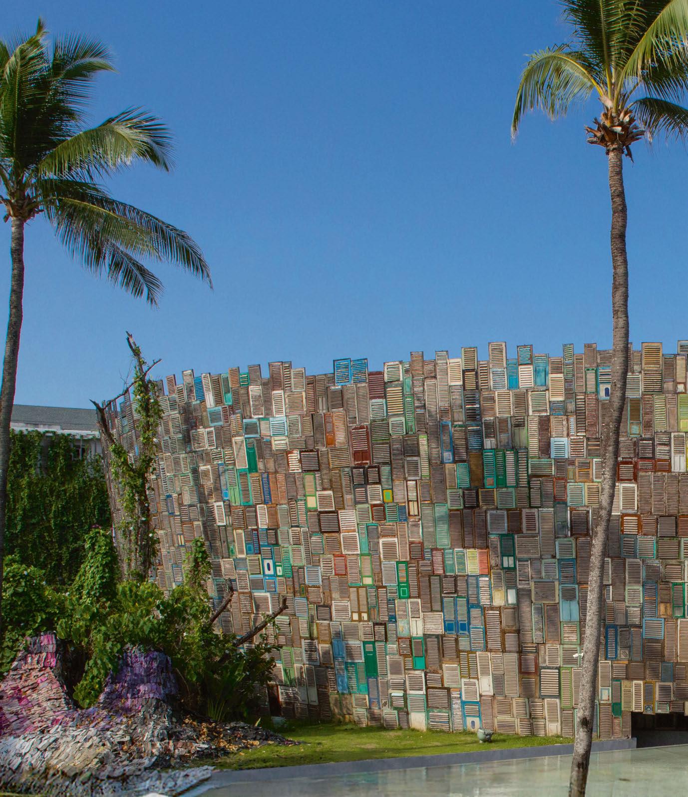 Characteristic forms, featureless faces and bold use of colour are the defining features of the work of American artist and designer Brian Donnelly – or KAWS, as he is more commonly known. Since the 1990s, his recurring cast of cartoonlike characters have been exhibited at museums, galleries, showrooms and airports, also making guest appearances in the world of hospitality. A larger-than-life sculpture resides in the doubleheight lobby of the historic Four Seasons Hotel Madrid for example, while a 6m-tall bronze statue towers over the entrance of Mondrian Singapore Duxton, ready to welcome guests and setting the tone for what lies within.