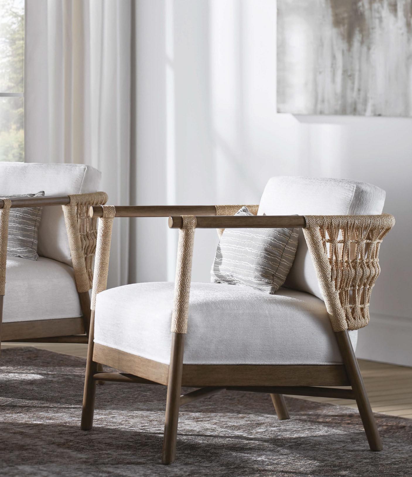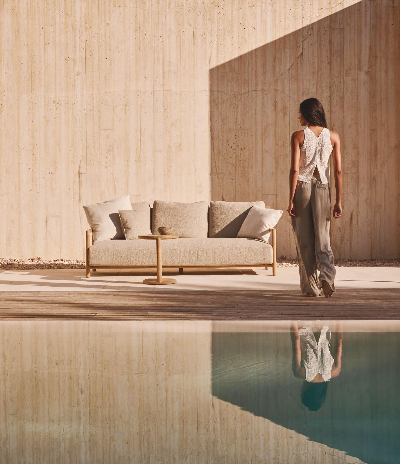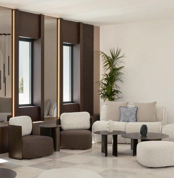 Designed by Sebastian Herkner, Boheme is a nature-inspired collection comprising an armchair, lounge chair, two- and threeseater sofas, lanterns in three sizes, two cocktail tables and a side table featuring glazed lava stone tops. The range is characterised by seating with dual-toned polypropylene straps handwoven around powdercoated aluminium frames in three colourways –Alabaster/Brook, Bronze/Mariana and Talc/Mojave. Janus et Cie employed specialised machinery to create rich and unique woven fibres through a complex engineering process. Handwoven on a smaller scale over stainless steel framing, the USB-rechargeable lanterns are available in three sizes and colourways to match the Boheme seating options. www.janusetcie.com