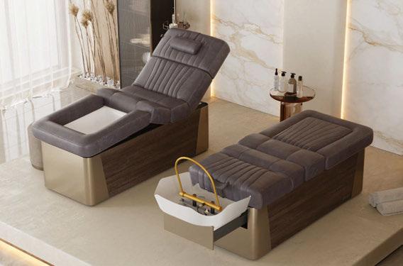 The Venice Head Spa by Lemi Group merges aesthetics with ergonomics to offer a multisensory experience. Combining massage, manicure, pedicure and a Japanese head spa in a single station, the multifunctional massage table enables spas to optimise space without compromising on excellence. Fully customisable, the antibacterial and fire-resistant memory foam mattress features a removable horseshoe headrest and is complemented by sustainable Vita upholstery and FSCcertified wood finishes with refined metallic inserts. At its heart lies a retractable wash basin which pairs with a water arch to gently caress the head with a steady flow that stimulates circulation and relaxes the muscles.