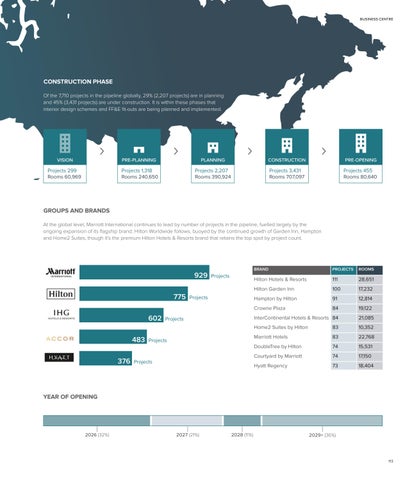 CONSTRUCTION PHASE Of the 7,710 projects in the pipeline globally, 29% (2,207 projects) are in planning and 45% (3,431 projects) are under construction. It is within these phases that interior design schemes and FF&E fit-outs are being planned and implemented.