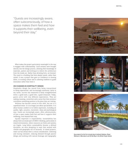 ON CHANGES IN HOSPITALITY DESIGN Hospitality design has moved from being transactional to being experiential, and increasingly emotional. Early in my career, success was measured in fairly straightforward terms: a good room, a good view, a good restaurant. Today, guests arrive with very different expectations. They are seeking meaning, connection and a sense that their presence contributes something positive to the place they are visiting. Wellness has become central to this shift, but not in a superficial sense. It is no longer just about spa facilities. It is about human comfort in its fullest expression, including air quality, light, acoustics, movement, sleep and psychological ease. Guests are increasingly aware, often subconsciously, of how a space makes them feel and how it supports their wellbeing, even beyond their stay. Equally important is responsibility. Sustainability has always been an innate part of OBMI’s thinking, particularly in island environments, where resources are finite and systems are fragile. Long before sustainability became a defined discipline, we were designing in ways that worked with climate and geography out of necessity. In island projects, water use has always been a critical consideration. Collecting and reusing rainwater, reducing demand through passive design and working with natural drainage and topography