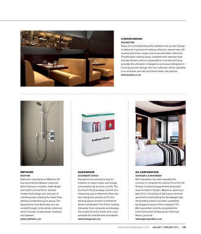 LYNDON DESIGN ARLINGTON Sleep 2012 provided the perfect platform for Lyndon Design to debut an inspirational seating collection, several new soft seating upholstery ranges and occasional table collections. The Arlington seating range, complete with separate back and two tiered cushions suspended on a hardwood frame, provides the ultimate in indulgence and luxury. Designed inhouse by Lyndon Design, the new collection will be available in an armchair, and two and three seater sofa options. www.lyndon.co.uk