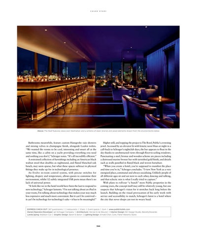EXPRESS CHECK-OUT: 367 guestrooms | 2 restaurants | 3 bars | Event spaces | Gym | www.publichotels.com Owner/Operator/Developer: Ian Schrager Company | Architecture: Herzon & de Meuron | Interior Design: ISC Design Studio; Bonetti/Kozerski Landscaping: Madison Cox | Graphic Design: Baron & Baron | Lighting Design: Arnold Chan; Core; Fisher Marantz Stone