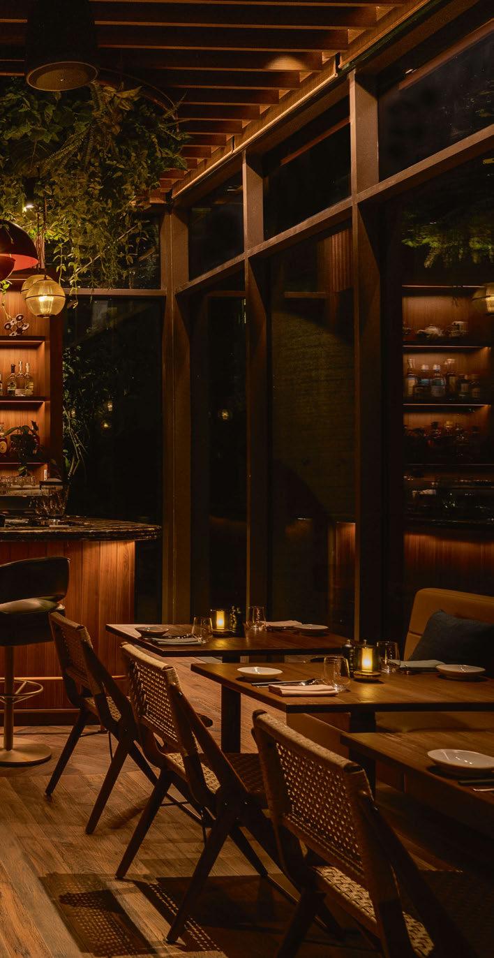 sweeping roofscape and curving façade, which opens out to a spacious deck and private pool. Back on land, the treetop spa nestles in the canopy to further immerse guests in nature. Spa pods centre around biophilic design principles, while open-air relaxation spaces offer panoramic views of the landscape. And rounding out the facilities, the five dining venues are rooted in local culture, drawing on locally sourced materials and handcrafted furnishings to create an authentic setting.