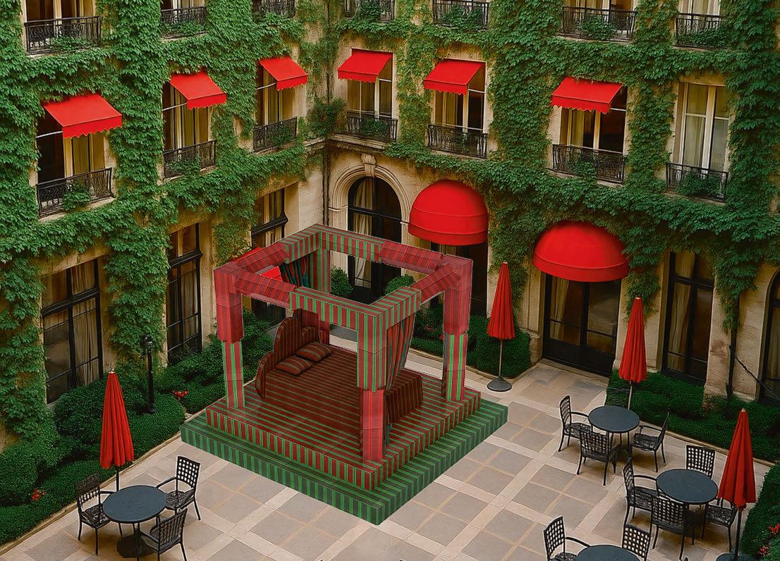 There are few Parisian hotels as iconic as Hôtel Plaza Athénée. From its Haussmann-style façade lined with wrought iron balconies and red geranium-filled window boxes, to its Versaillesinspired dining room, the Palace hotel has been the place to see and be seen since it first opened its doors on Avenue Montaigne in 1913. At its heart is La Cour Jardin, a Brittany-inspired al fresco brasserie surrounded by sweeping curtains of Virginia creeper and red awnings. In recognition of its iconic status, as well as the hotel’s commitment to promoting art, French design studio Uchronia has chosen the courtyard as the subject of its latest Day Bed installation. As part of Paris Design Week and running until 11 November, the hotel courtyard will be transformed into a place of contemplation and wonder, where craft, colour and contemporary