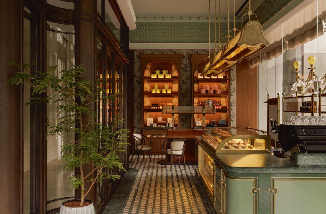 design converge. Taking centre stage is a giant four-poster bed that reinterprets the fundamental elements of a bed with playful, maximalist and brilliantly bold details. Created in collaboration with Dutch ceramic tile brand Palet, the tableau is clad almost entirely in verdant green and red glazed tiles that subtly shift in tone throughout the day, mirroring the hotel’s signature colour palette. The elaborate display is anchored by a bed dressed in rich fabrics by Le Jacquard Français, and crowned by a cloud-shaped custom headboard crafted by artisanal manufacturer Tréca. The ensemble is complemented by floral patterned curtains and cushions. With added chrome accents courtesy of Seigneurie to reflect the shifting Parisian light, Uchronia’s Day Bed evokes an imaginary state between functional design and dreamy wonder.