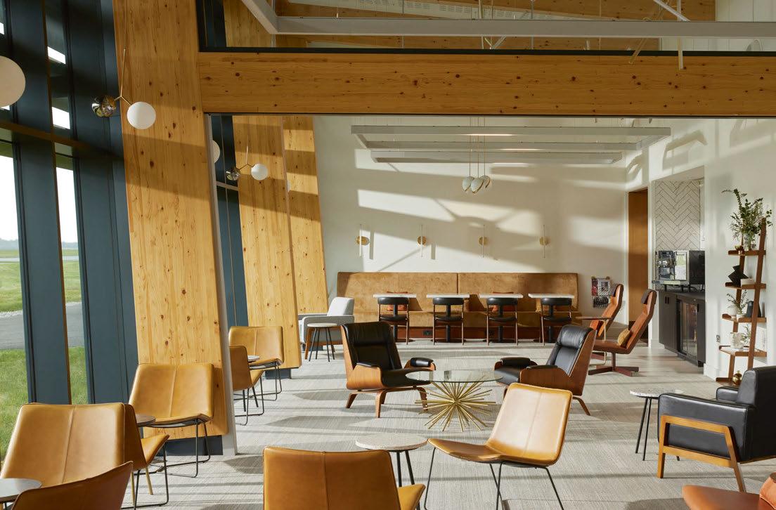 Accessible to all ticketholders regardless of cabin class – a first-of-its-kind initiative in the UK – Aether’s Scandiinspired design sets the tone for a calm and relaxing encounter. Steel and timber beams cast striking silhouettes across the space, floor-to-ceiling windows frame panoramic runway views, and leather armchairs sit alongside velvettopped stools – the perfect front-row seat to watch planes taking off and coming into land. This is all complemented by a fine dining offering that serves as an introduction to northern British fare.