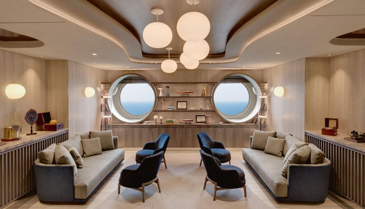 The design scheme is inspired by Middle Eastern cultural heritage, subtly combining traditional motifs with contemporary detailing, while the amenities on board rival those of a luxury hotel. On arrival, the lobby opens into the Celestial Lounge with a bar serving light refreshments. The multifunctional Work & Balance suite can be used as a private office or for