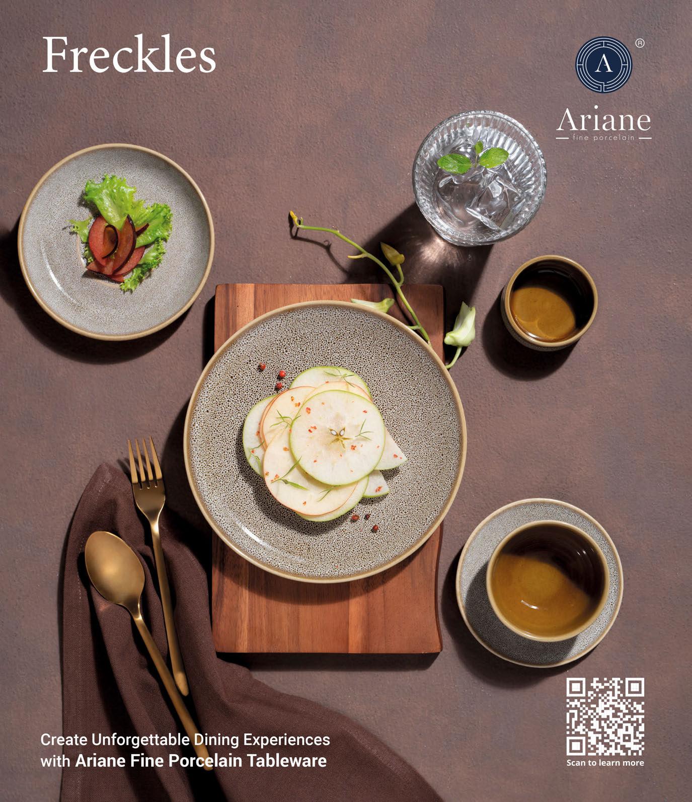 reduces the need for frequent replacements, helping professionals minimise waste while maintaining aesthetic excellence. Yet, sustainability extends beyond just the brand’s product lines. Strict waste management processes see 100% of green, non-fired materials and bisque reused. And in an upcoming phase, the brand plans to also repurpose glaze-fired waste, setting new benchmarks for waste reduction in the sector. The commitment to a greener future isn’t limited to internal practices either. Through consumer education initiatives, such as the Slow Fast collection, the company encourages restaurants to replace disposable packaging with elegant, reusable porcelain, reinforcing sustainable dining practices. Meanwhile, community engagement, including the donation of solar panels and water conservation tools, illustrates a deep investment in social responsibility. Looking ahead, Ariane’s investment in cuttingedge R&D reflects a longer-term vision. Ongoing development of energy-efficient infrared kilns, which consume less energy and produce minimal heat waste, showcases the brand’s forward-thinking approach to reducing its overall carbon footprint. www.arianefineporcelain.com