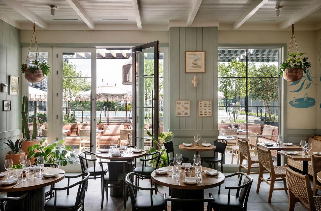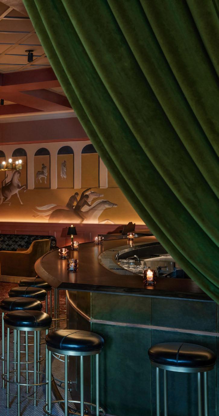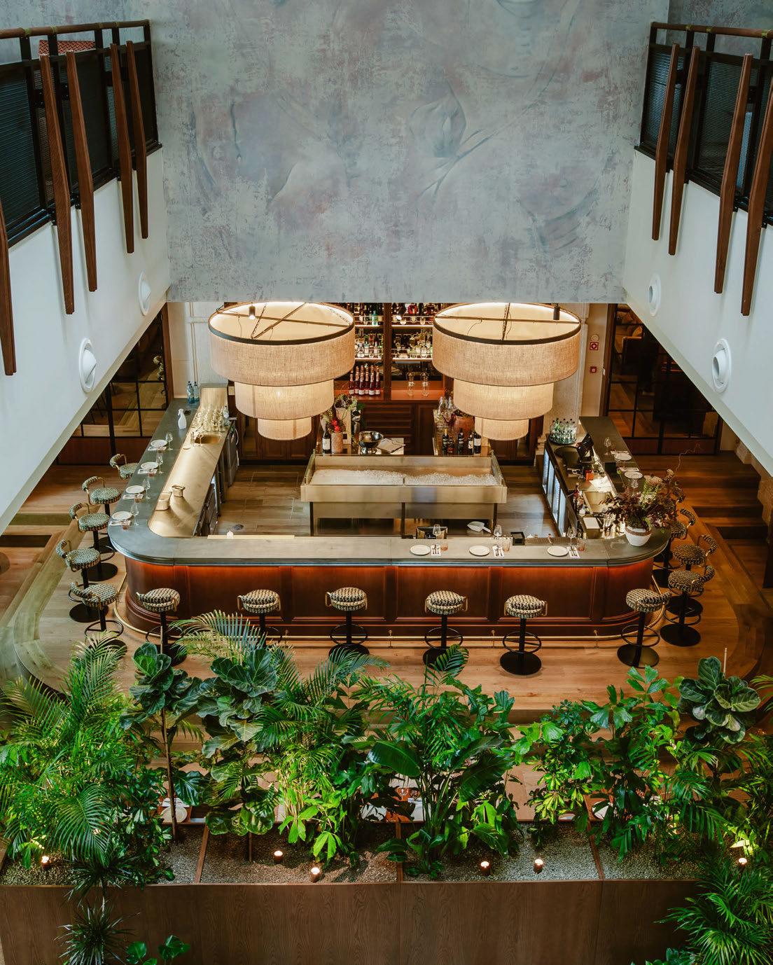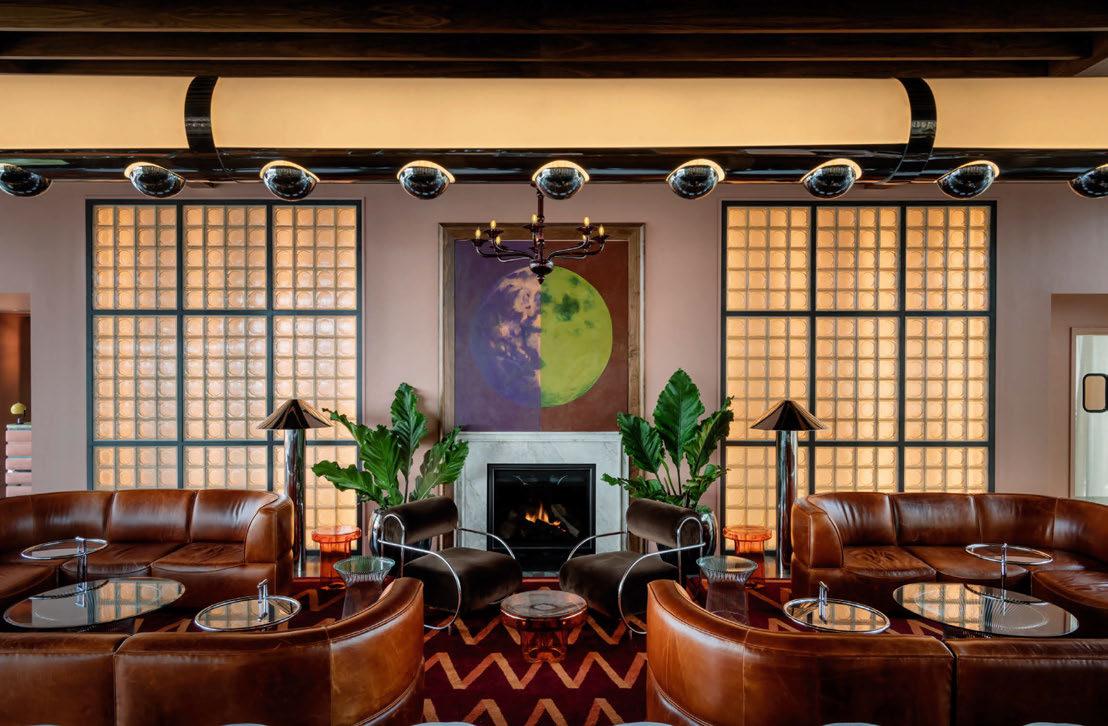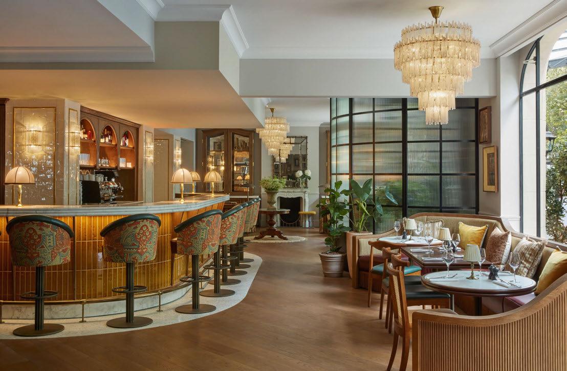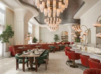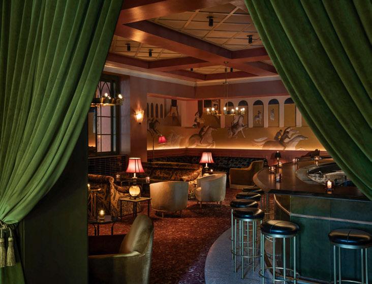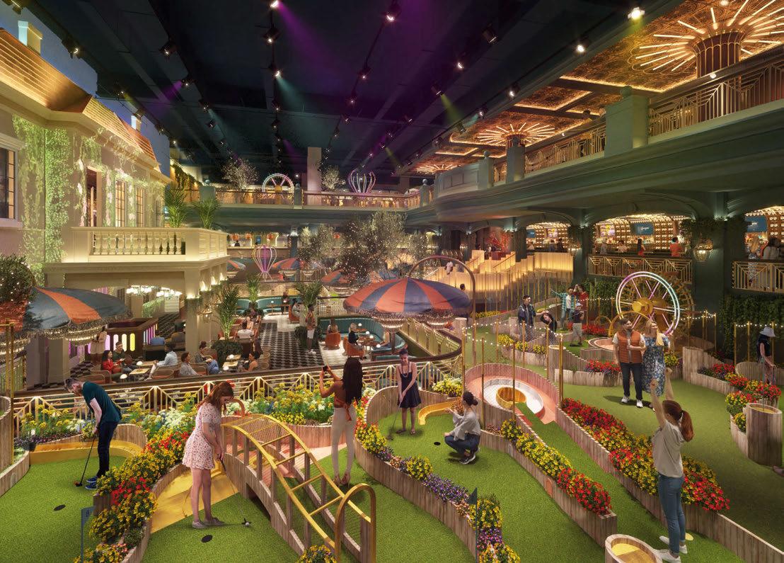 house façade with portico terrace, putting greens surrounded by landscaped gardens and LED hotair balloons that seemingly float up above. The restaurants and bars meanwhile are adorned with woodland wallcoverings and whimsical beehivestyle lighting, reinforcing the outdoors nature of the game.