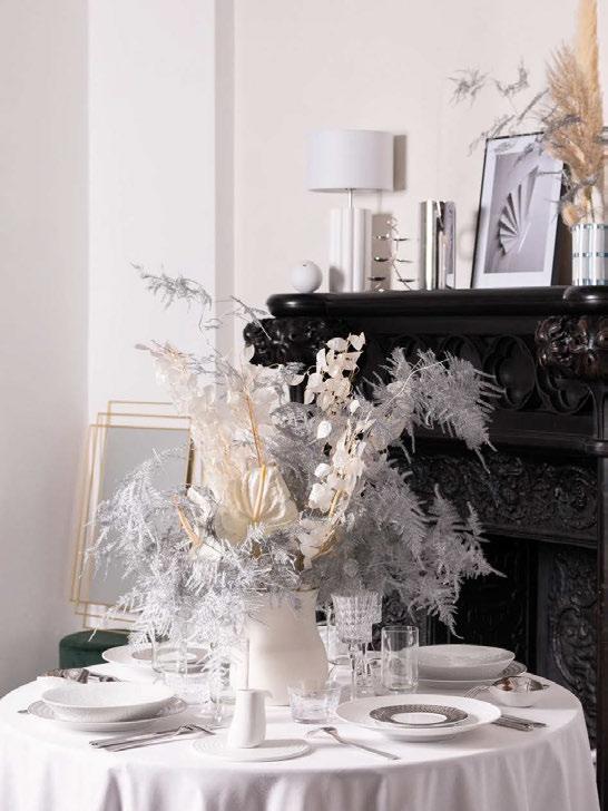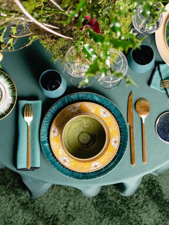 A new take on festive elegance emerges as deep emerald tones meet opulent gold, creating a mood reminiscent of turn-of-thecentury grandeur. Lavish textiles, richly coloured glass and organic shapes are at the forefront, where nature’s influence is unmistakable. Think fine china adorned with intricate peacock