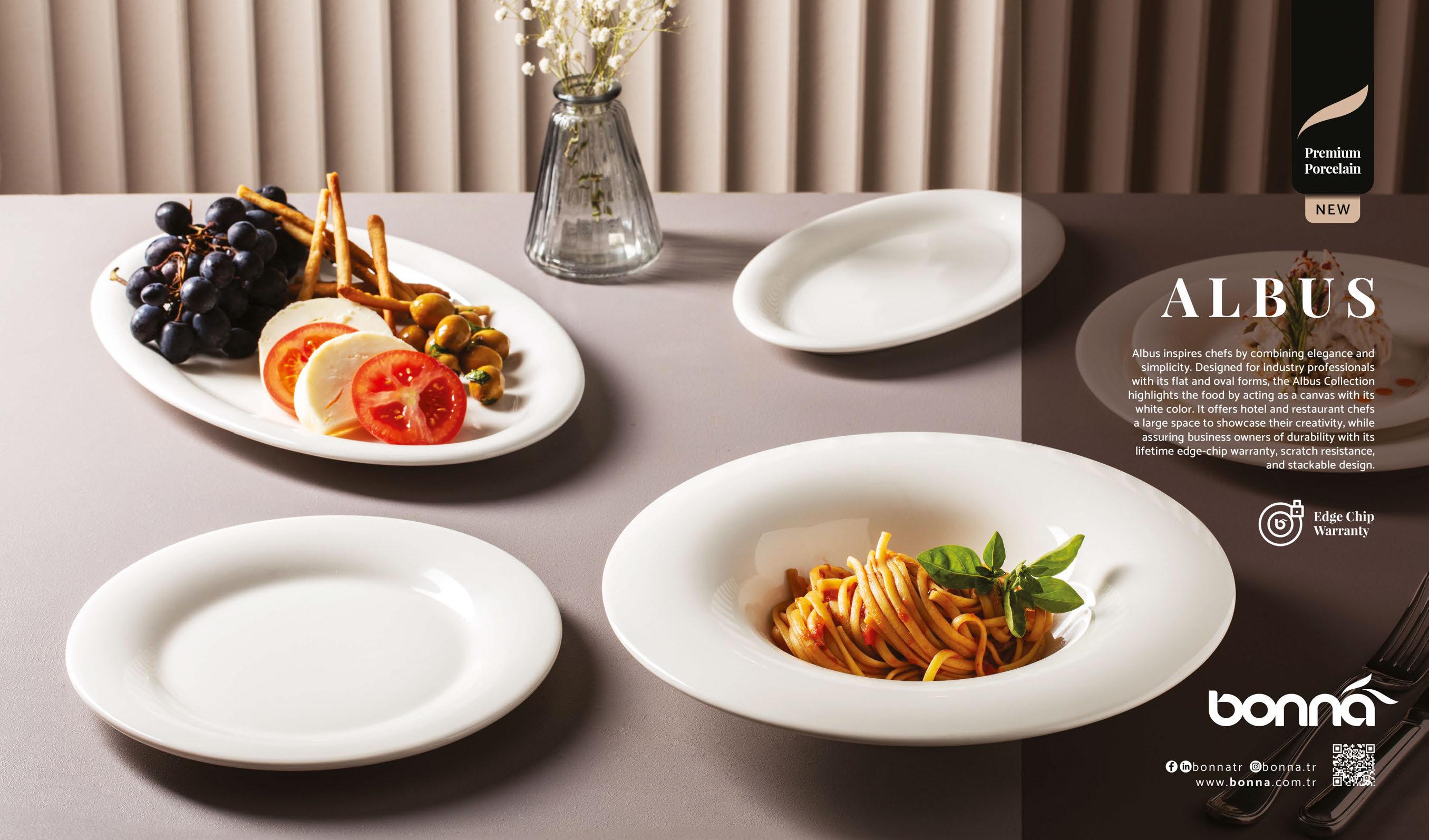 Turkish porcelain brand, Bonna, unveils the Albus Collection, a harmonious blend of elegance and simplicity. This refined collection brings a timeless aesthetic to professional dining settings. Characterised by its flat and oval forms, the Albus line is thoughtfully crafted for culinary leaders who seek to elevate their presentations. The pristine white porcelain serves as a blank canvas, enhancing the visual appeal of dishes. While offering hotel and restaurant chefs a large, open space where they can showcase creativity, each piece also ensures durability with a lifetime edgechipping guarantee, scratch resistance and a stackable design.