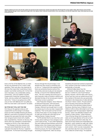 knew a fair few of the Slipknot crew, so when the job was presented to me it made it really appealing. There were also a few openings on the crew that meant that I could bring in some people I was familiar working with. So from the start it has been a very comfortable working environment.” One such addition included Coopersmith’s Production Assistant Marvin Torres, who has worked with Coopersmith for some time. “I knew it was going to be a little crazy on tour with Slipknot and I can safely say there has never been a dull moment!” he stated. NO PYRO BUT STILL GOT THE FIRE First thing on the agenda to discuss with Coopersmith was the change in set design. Known for their incredibly ferocious live shows, Slipknot’s usual antics of jumping off ramps and hanging from percussion kits have more often than not gone hand-in-hand with a healthy dose of pyrotechnics. However on this tour, the band’s show has undergone a transformation, swapping out fire for a new video element. “The changes to the show started to be discussed around September last year when I got given the dates for this tour,” explained Coopersmith. “As the band had already brought