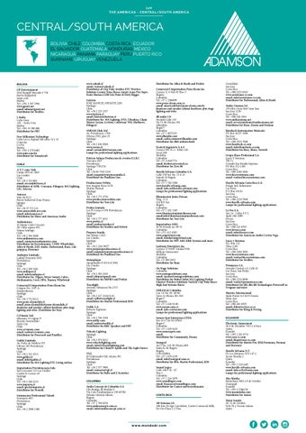 BOLIVIA GP Entertainment Noel Kempff Mercado # 736 Barrio Equipetrol Santa cruz Bolivia Tel: +591 3 387 3994 www.gpent.net email: admin@gpent.net Distributor for Avolites J Audio Calle Clara 140 - Santa Cruz Bolivia Tel: +591 33 506 006 Distributor for FBT New Millenium Technology Calle Luís Espinal 100 entre 32 y 33 Cotacota La Paz Bolivia Tel: +591 2 279 8405 www.nmt.com.bo Distributor for Soundcraft CHILE A V C com. Ltda Callao 2970 of. 1003 Las Condes Chile Tel: +56 2 324 680 email: avccomld@terra.cl Distributer of ADB, Cooemar, Filmgear, MA Lighting, LSC, Selecon Amexco Sitio 44-B L2 Barrio Industrial Zona Franca Iquique Chile Tel: +56 57 573 231 www.amexcoltda.net.com email: info@amexco.cl Distributor for Shure and American Audio Audiomusica 43 Monte Carlo Crescent AV Chile espana 393 Nunoa Santiago Chile Tel: +56 2 384 2000 www.audiomusica.com email: contacto@audiomusica.com Distributor for beyerdynamic, COEF, Wharfedale, Allen & Heath, DAS Audio, Turbosound, Rane, Lab. gruppen, Drawmer Audiopro Limitada Ladislo Errazuriz 2032 Providencia Santiago Chile Tel: +56 2 269 2481 www.audiopro.cl email: info@audiopro.cl Distributor for Digico, Meyer Sound, Calrec, Mediamatrix, Crest, DPA, Tannoy, Whirlwind Comercial E Importadora Penn Elcom Inc Cotapos No. 1387-A Independencia Santiago Chile Tel: +56 2 732 0212 www.penn-elcomchile.cl email: penn-elcomchile@penn-elcomchile.cl Roadcase and speaker cabinet hardware plus stage lighting and truss. Distributor for Fane CyVmusic Ltd. Manzana 14 Galpon 9 Recinto Amurallado Zofri City Chile www.cyvmusic.com email: carlos@cyvmusic.com Distributor for Powersoft and Pixelflex Galilei Limitada Av. Pedro de Valdivia 555 Oficina 205 Providencia Santiago Chile Tel: +56 2 341 4313 www.galilei.cl email: info@galilei.cl Distributor for MA Lighting ETC Living surface Importadora Providenciacia Ltda San Crescente 113 Las Condes Casilla 91 Correo 10 Santiago Chile Tel: +56 2 246 2333 www.importa.cl email: jpsch@importa.cl Distributor for Neutrik Luminacion Professional Valook Seminario 605 Providencia Santiago Chile Tel: +56 2 2988 1500