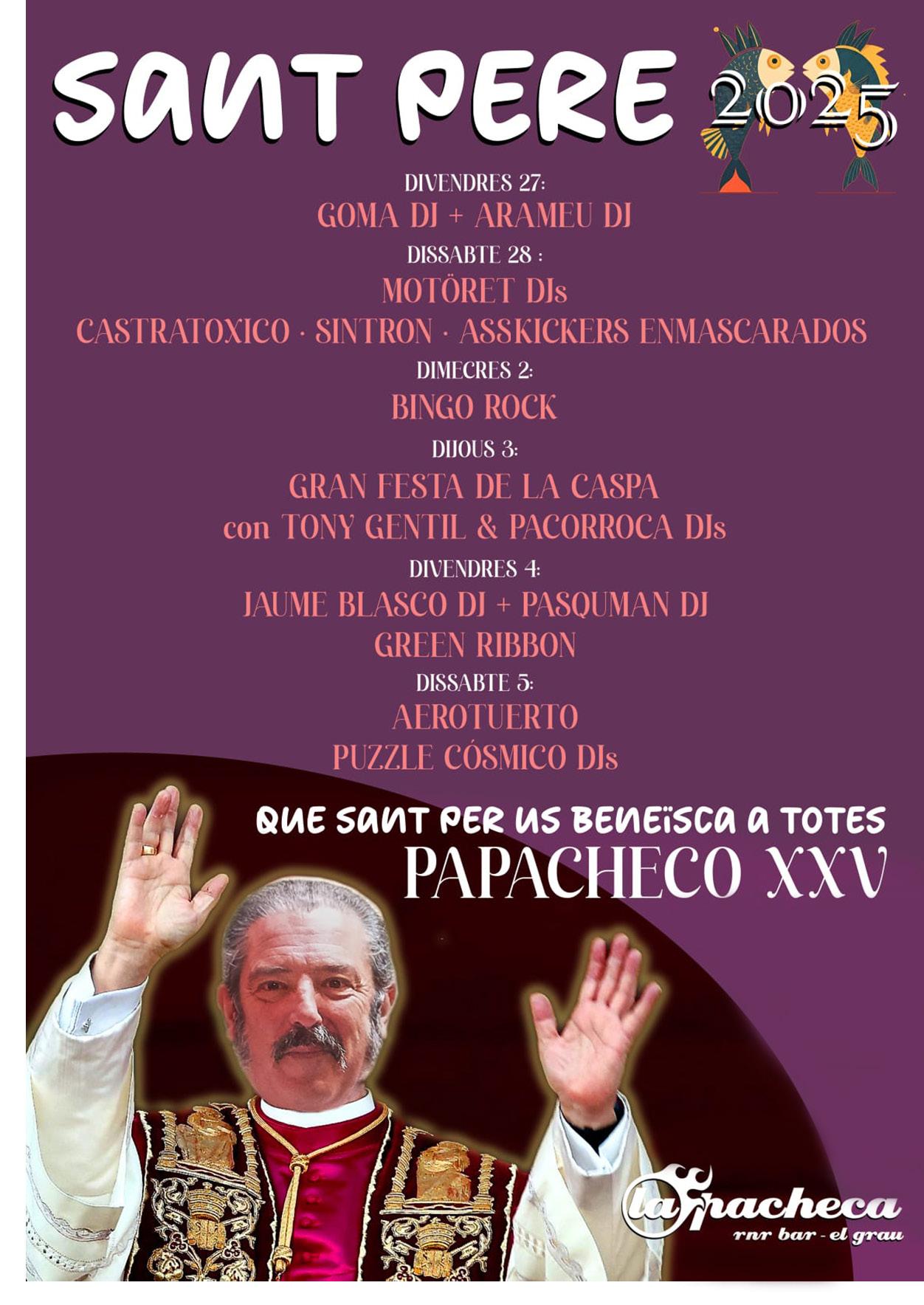 RR Del 27 de junio al 5 de julio, fiestas de Sant Pere frente a La Pacheca en el Grao de Castellón, con Goma Dj y Arameu Dj el viernes 26, los conciertos de Asskickers Enmascarados, Sintron y Castratóxico, Motöret Djs el sábado 28, Bingo rock el miércoles 2, la Gran Fiesta de la caspa con Toni Gentil y Pacorroca Djs el jueves 3, Green Ribbon, Jaume Blasco Dj y Pasquman Dj el viernes 4, y Aerotuerto y Puzzle Cósmico Djs el sábado 5.