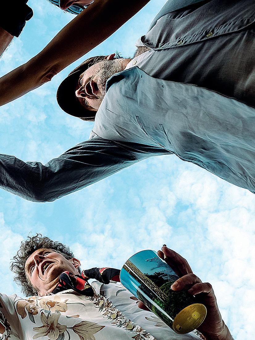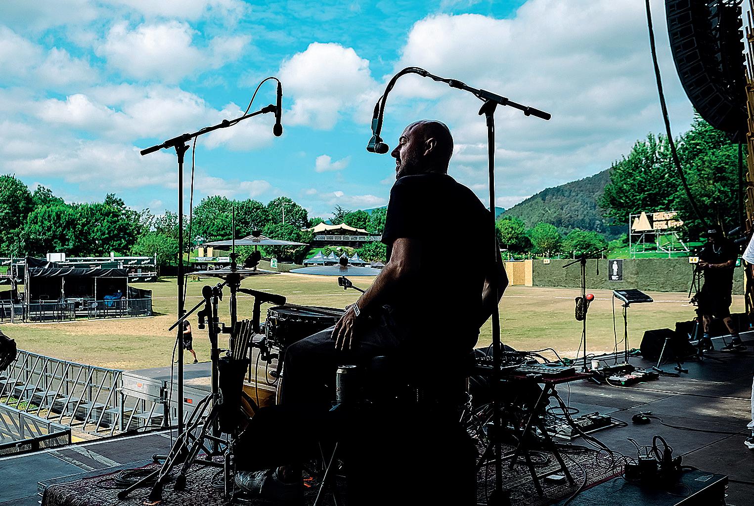 LA PRUEBA TOCA A SU FIN y llega la hora de comer. Abandonamos el escenario principal y nos dirigimos a pie a la zona de backstage desde la que se puede disfrutar de unas estupendas vistas a las verdes colinas que rodean este idílico emplazamiento. Caen las primeras cervezas y nuestras pulseras nos permiten acceder a la carpa comedor en la que nos espera un apetitoso buffet libre en el que no faltará la carne, el pescado, las verduras, pero tampoco el txacoli y un buen rioja. Sentados alrededor de la mesa, surgen las primeras conversaciones, las bromas y la decisión de ir a pasar la tarde a la piscina comunitaria de Jaime. Mientras bajamos de Kobetamendi, empezamos a ver las primeras txarangas que, con sus instrumentos de viento, hacen más llevadera la peregrina ascensión al festival de los más tempraneros.