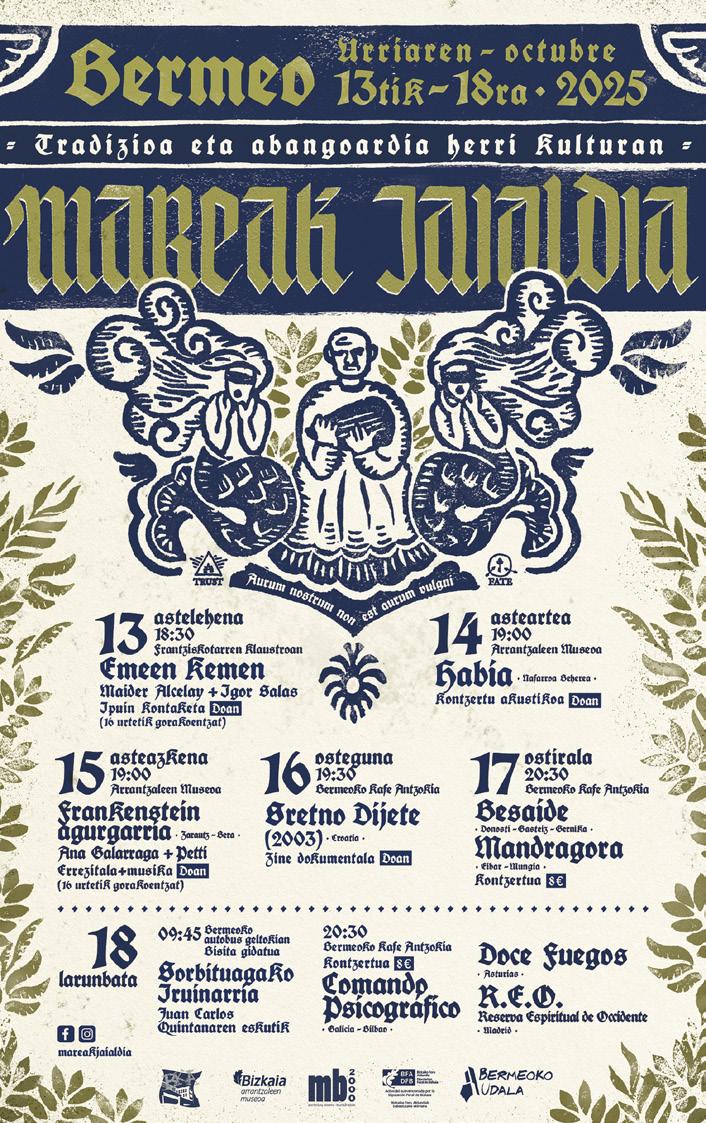 POR UNDÉCIMO AÑO, la localidad costera vuelve a llenarse de actividades en las que confluyen tradición y vanguardia en la cultura popular. Además de visitas guiadas, charlas, contacuentos o cine documental, la música volverá a ser la protagonista con conciertos de diversas bandas. Por Bermeoko Kafe Antzokia o Arrantzaleen Museo pasarán bandas como la madrileña Reserva Espiritual de Occidente, la gallega Comando Psicográfico, la asturiana Doce Fuegos, el trío de voces e instrumentos de cuerda de Iparralde Habia, la gernikarra Besaide, el dúo Mandrágora y Petti, quien presentará junto a Ana Galarraga, una carta musicada basada en el clásico gótico Frankenstein de Mary Shelley. MS
