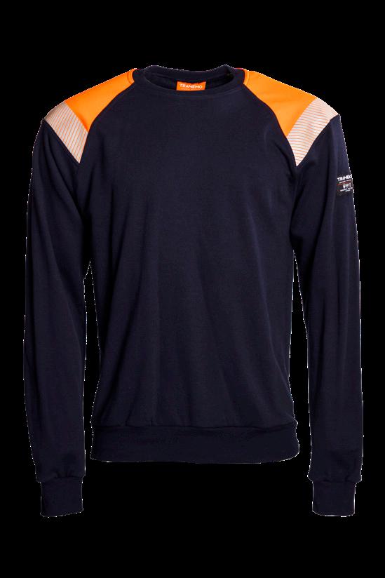 Metallfreies, inhärent flammhemmendes Sweatshirt mit Rundhalsausschnitt. PFAS-freier Stoff, bei dem 50% des Baumwollanteils recycelt wird. Strickbündchen an Kragen, Ärmeln und Saum. Segmentierte Thermoreflexstreifen für erhöhten Tragekomfort.