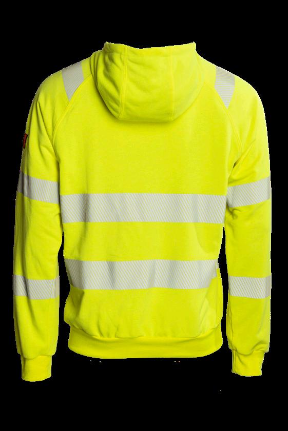 Metallfreies, inhärent flammhemmendes, weiches und comfortables HI-VIS Sweatshirt mit Kapuze. PFAS-freier Stoff, bei dem 50% des Baumwollanteils recycelt wird.
